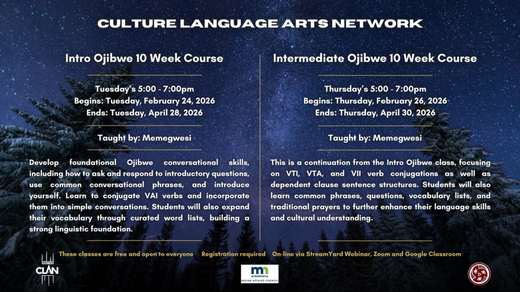 The class is free and open to everyone. No prior knowledge of Ojibwe is required. Instruction takes place on StreamYard Webinar, and materials are shared on Google Classroom. Classes take place on Tuesdays from 5:00 – 7:00 p.m. CST starting Feb. 24. Registration closes at 5:00 p.m. CST on Monday, March 2, or when 1,000 students have registered, whichever occurs first.